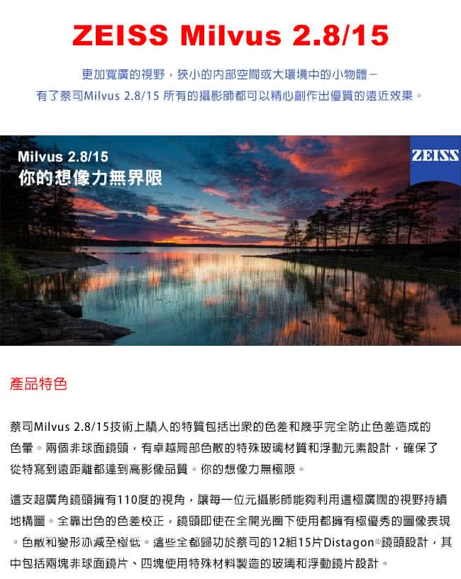 【ZEISS 蔡司】Milvus 2.8/15 ZE For Canon(公司貨)是我這陣子選購的,用起來的評價真的不錯